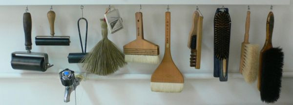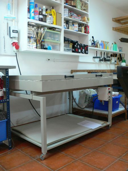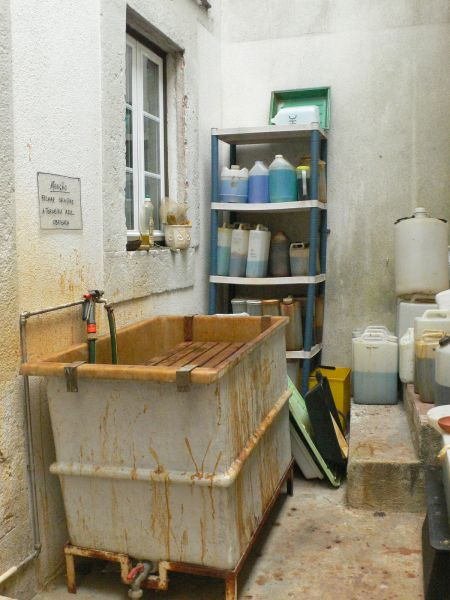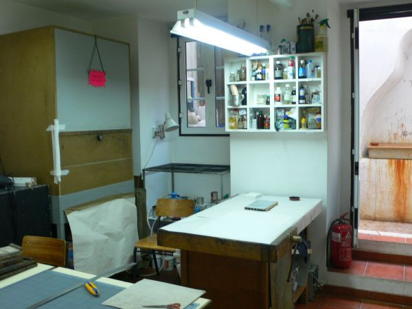 A caixa de resinas e o compressor para aerógrafos, permitem a execução de águas tintas, tanto utilizando processos tradicionais como usando métodos mais recentes e menos tóxicos. No espaço exterior, de pequena dimensão, encontra-se a zona destinada aos ácidos e sais, ao polimento e à lavagem das chapas, bem como à utilização de aerógrafos. |