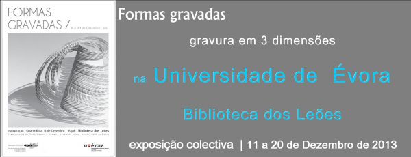 Na Galeria dos Leões, Universidade de ÉvoraA exposição Colectiva Formas Gravadas, estará patente ao público na Galeria dos Leões, Universidade de Évora, entre 11 e 20 de Dezembro de 2013. |